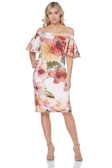 Roman Originals Women Floral Print Bardot Cold Shoulder Bodycon
