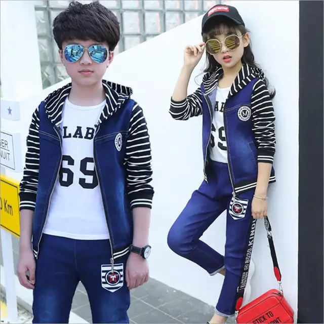 2019 New Boy Girl Denim Set Children S Spring Autumn Hooded Striped